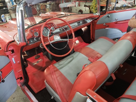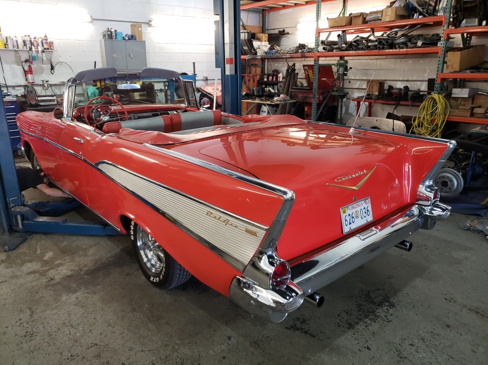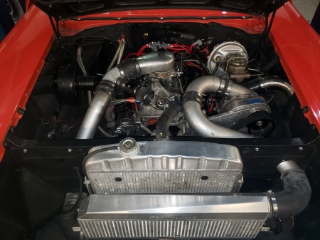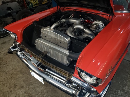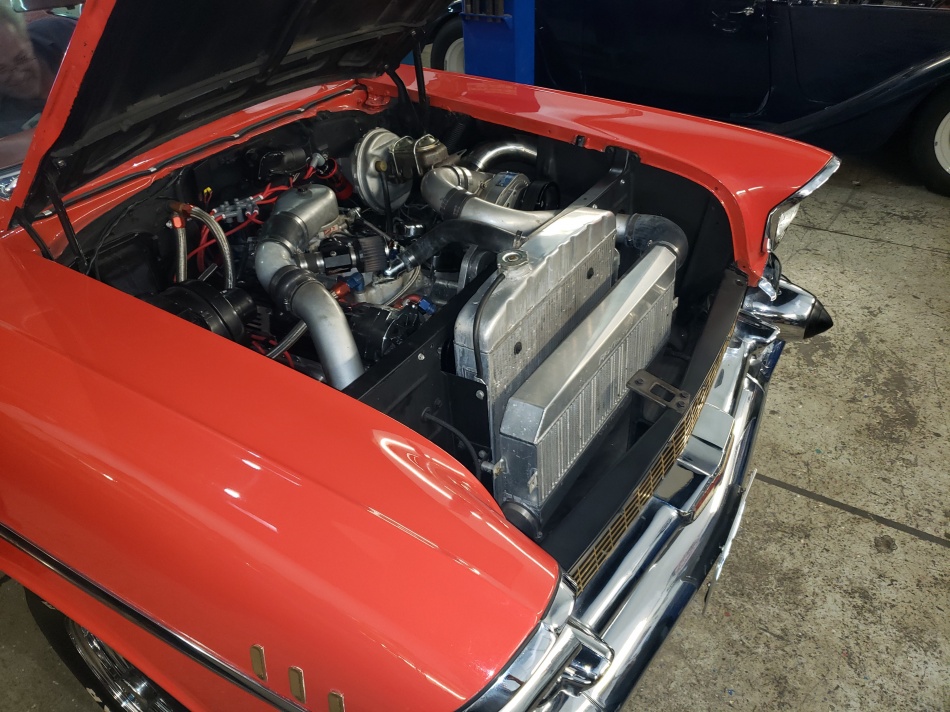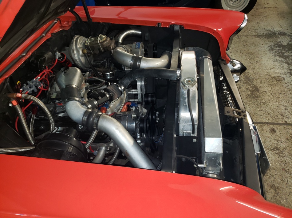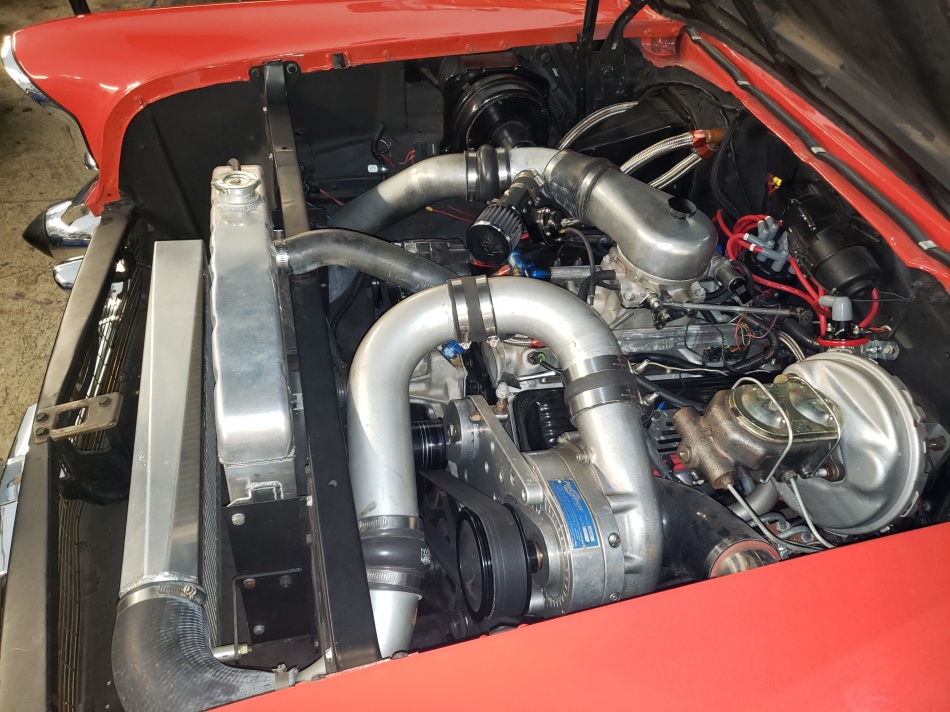 1957 Chevy Belair Convertible with a procharged 350 SBC, eldebrock EFI, and 4 speed manual transmission, and all wheel disc brakes.