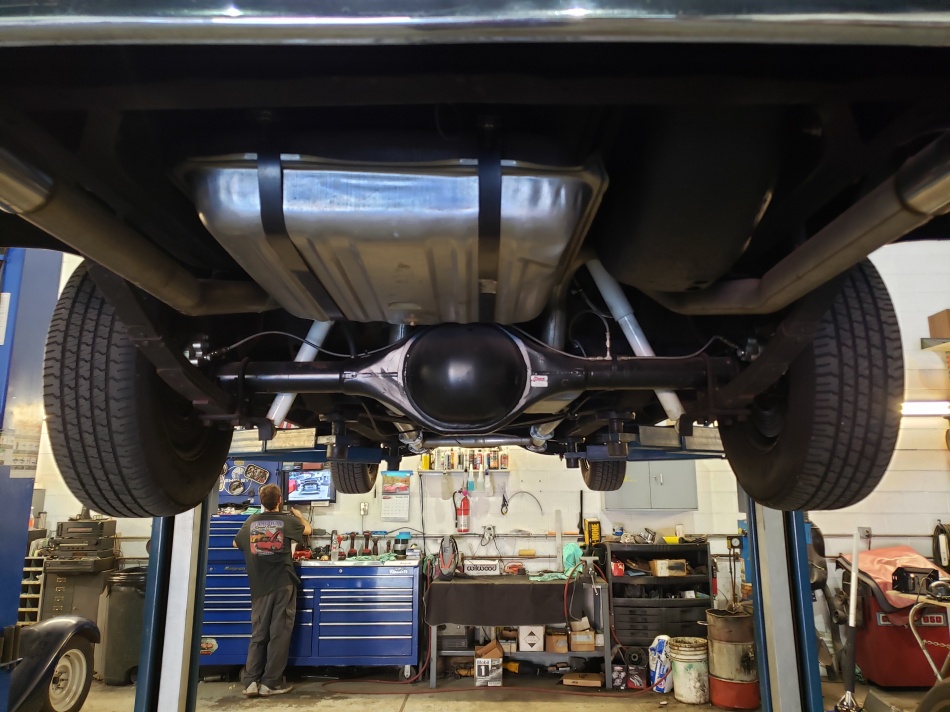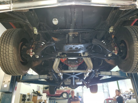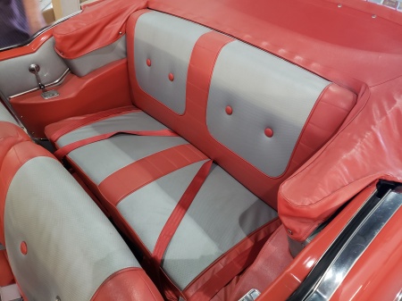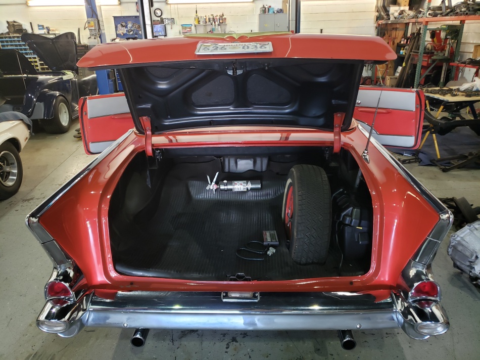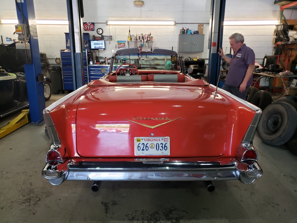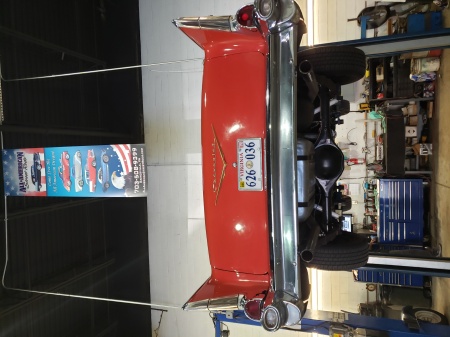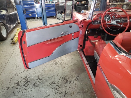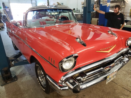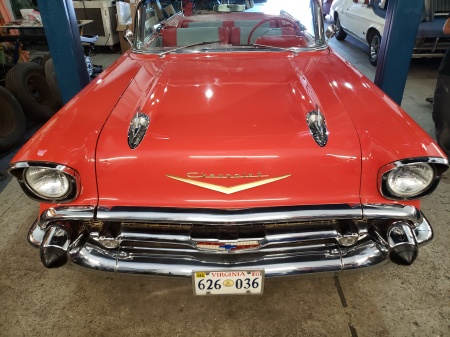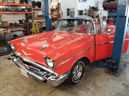 1957 Chevy Belair Convertible with a procharged 350 SBC, eldebrock EFI, and 4 speed manual transmission, and all wheel disc brakes.